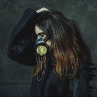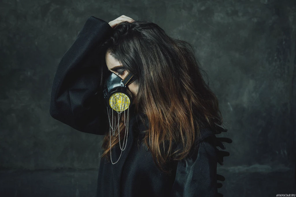 filter mask. Their eyes are closed, and they seem to be looking downwards towards the ground. The background is plain and does not provide any specific context about the setting.