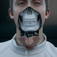 a skull mask or helmet with mechanical-looking features, such as a mouthpiece and possibly glowing eyes. This gives the impression of a robotic or cybernetic theme. The overall ambiance suggests