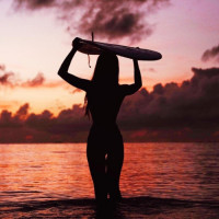 the evening sky, holding up what appears to be a surfboard. They are standing in