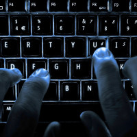 a computer keyboard. The hands are positioned over the keys, with fingers pressing down on the keys as they type. The background is dark, which highlights the activity taking place on the keyboard. This could be an example of someone working or communicating using a computer.