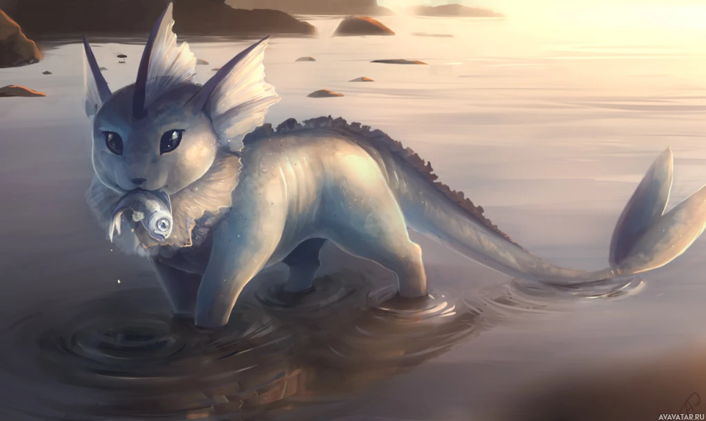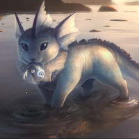 shallow water and appears to be holding something small within its hands that could possibly be another Pokémon or a different type of creature. The background suggests it might be evening, given