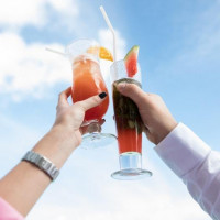 The image shows two people holding up their glasses, possibly filled with a fruity beverage like a daiquiri or mojito, as they appear to be celebrating or toasting. They are outdoors under a blue sky with some clouds, which suggests it might be a sunny day.