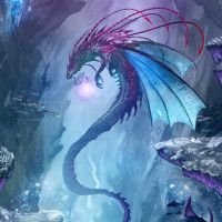 a fantasy scene featuring a dragon. The dragon is large and has a vibrant,