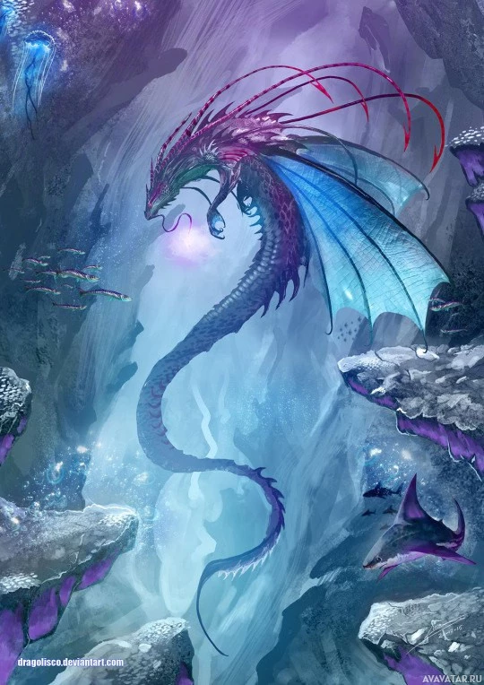 rock formations and a sense of depth due to the perspective. There are also smaller creatures swimming around the area. This image is likely associated with themes of