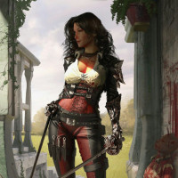 brown hair, is wearing armor with a design that suggests it could be from the Renaissance period, and she holds a sword in her right hand. There's blood on the ground around her feet, indicating some