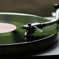 На снимке показан виниловый проигрыватель с записью на поворотном столе. Обложка альбома видна и содержит текст, указывающий на то, что это изображение, связанное с музыкой. На фото нет людей, сосредоточенных исключительно на музыкальном оборудовании и самой записи.
