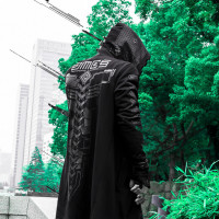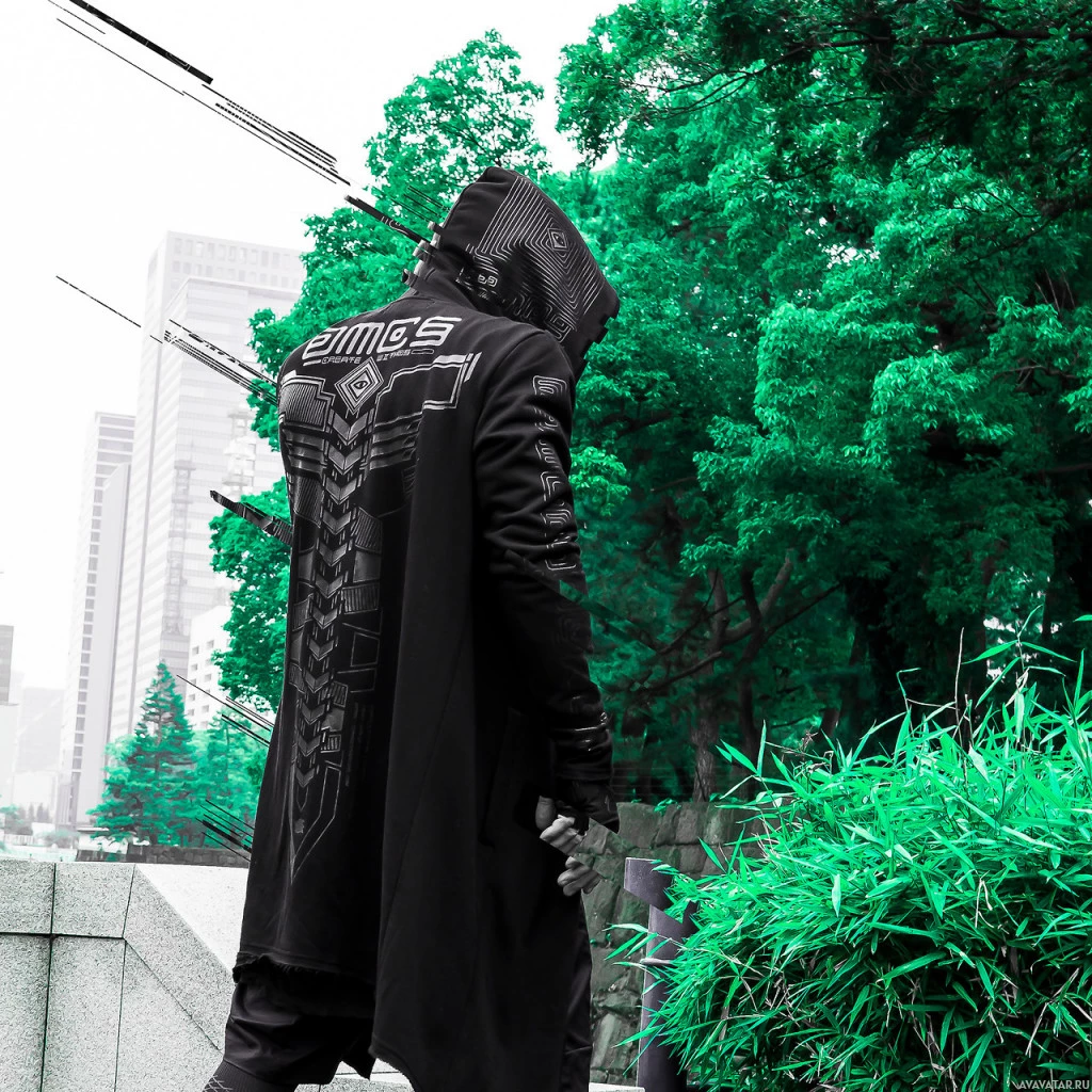 an urban setting with high-rise buildings that can be seen in the background. There are trees and bushes nearby, indicating a well-maintained cityscape. The person appears to be dressed in a style reminiscent of cyberpunk or science