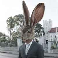 a rabbit mask or costume over their face. The mask covers the entire head and features