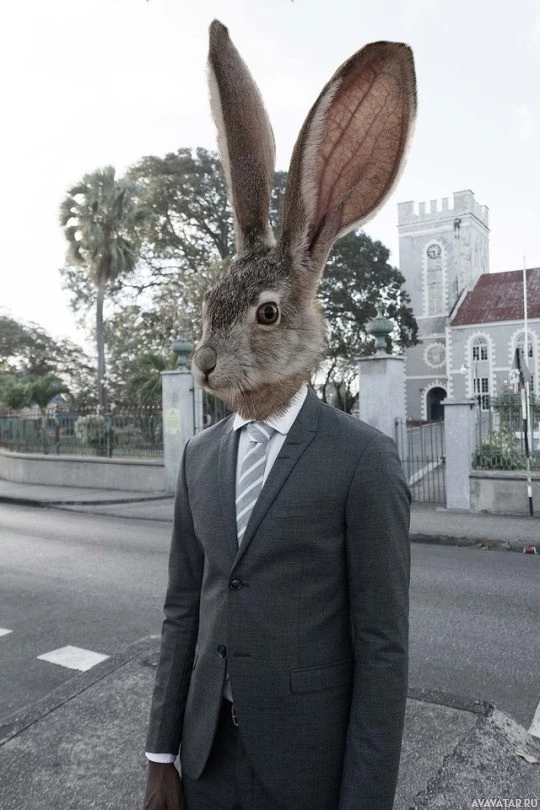 long ears that resemble those of a rabbit. The individual is dressed in formal clothing, including a dark suit with a tie, giving an unusual and humorous contrast between the serious attire and the playful