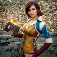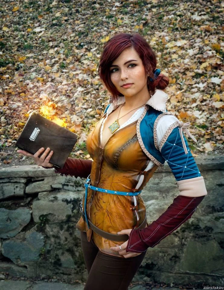 magical properties or a tome of some kind, which is fitting for the character they are portraying, as Triss is known for her knowledge in alchemy and magic. The setting suggests an autumnal environment, with