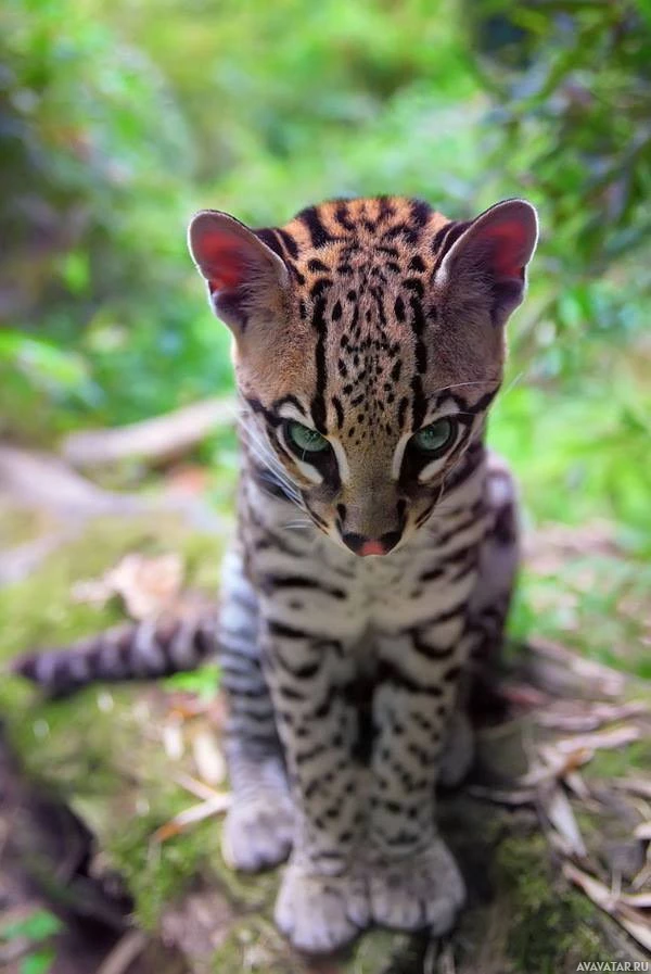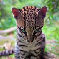 a wildlife scene featuring an animal, likely a small feline such as a leopard or panther due to its pattern of spots. The animal is sitting on what appears to be a rock and is looking directly at the camera with