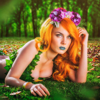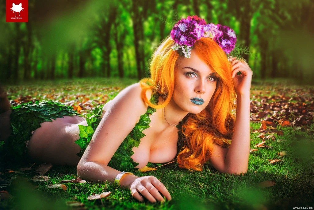 Poison Ivy, known for her iconic green skin and wild hair. The individual is lying on their stomach in what appears to be a forest setting with grass and