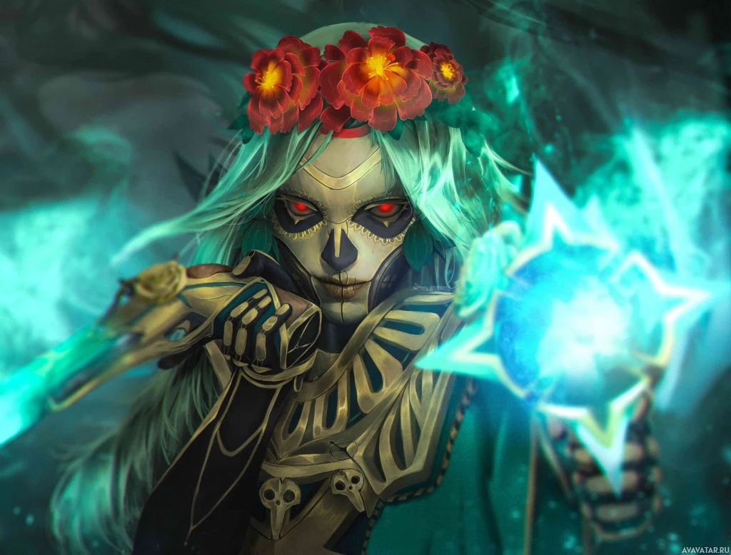 The image features an artistic representation of a character from the game Dota 2. This character is known as Muerta, and she is depicted with a distinctive design that includes a skull for a head and