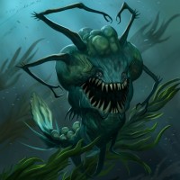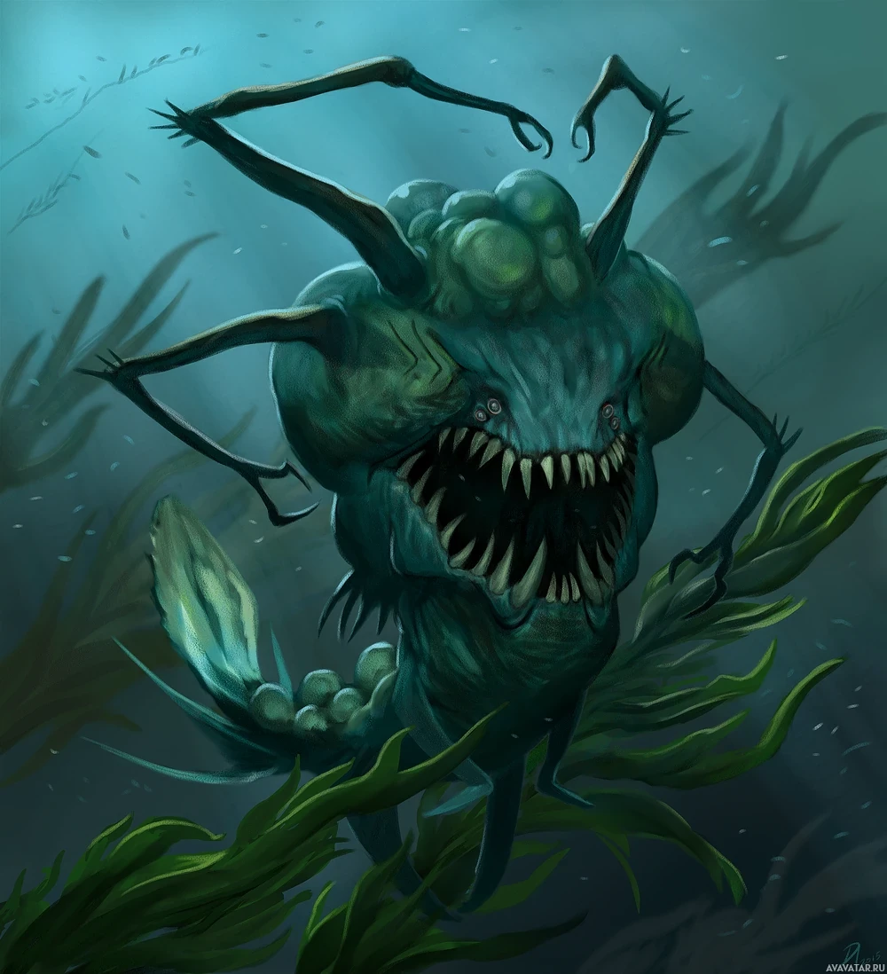 surrounding environment includes seaweed and what appears to be underwater plants. The overall style of the image leans towards fantasy and horror elements, evoking the sense of an unnatural and possibly harmful marine being.