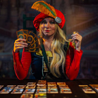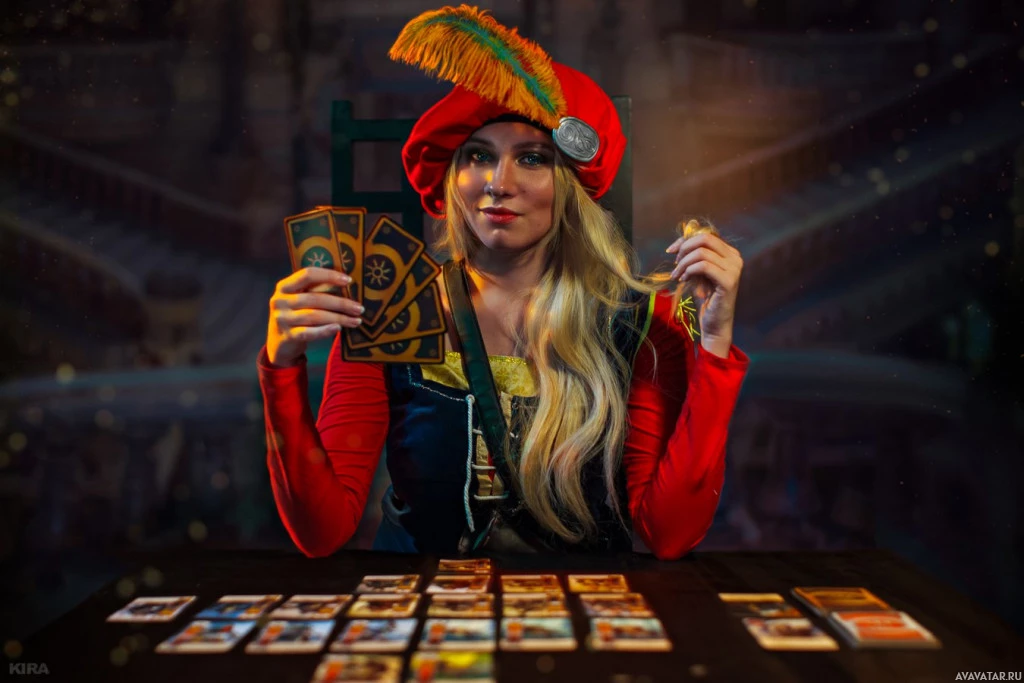 a feathered hat, and a mask with a pointed nose. She is sitting at a table with various cards spread out in front of her, suggesting she might be performing a tarot or similar