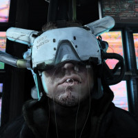 The image appears to depict a person wearing futuristic virtual reality goggles, which are likely part of