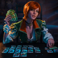 a female character who appears to be from the video game "The Witcher 3: Wild Hunt." She is seated at what seems to be a table with