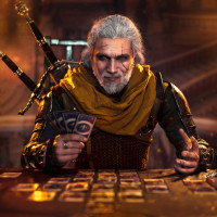 a card game or examining his hand for strategic purposes. Geralt's attire and weapons are typical of