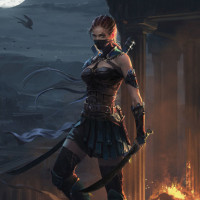 a female character who appears to be a warrior or guardian, standing confidently on a rooftop with her sword in hand. She has