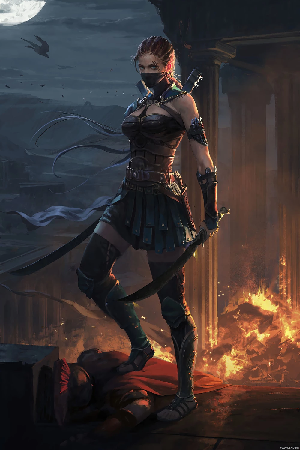 long hair and is wearing armor that suggests a fantasy or historical setting. In the background, there are signs of battle or destruction, including smoldering ruins and a fire at nighttime, which adds to