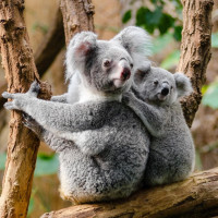 На картинке изображены две коалы, сидящие на ветке дерева. Они обнимают друг друга руками, и один из них, кажется, смотрит прямо в камеру. Это трогательное изображение этих очаровательных животных в их естественной среде обитания.