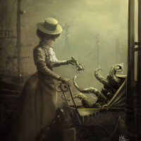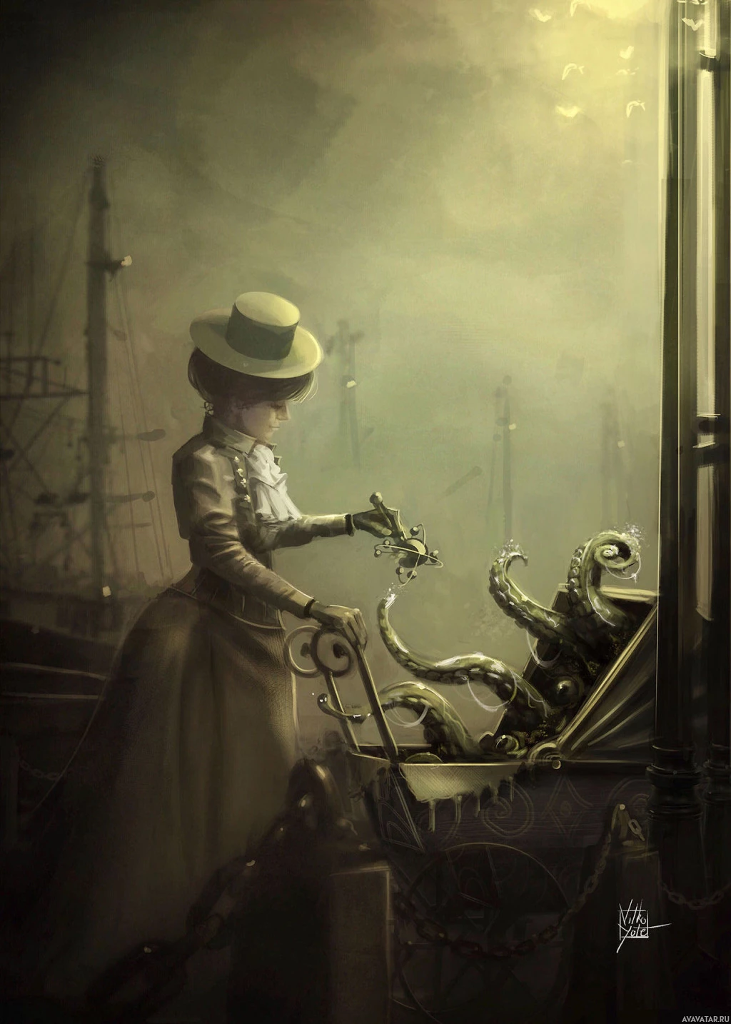 sea creature, as there are tentacles visible. Her expression suggests that she may be frightened or surprised by the encounter. The setting gives off a gothic or horror vibe, with misty atmosphere and industrial elements in the background, including ships and cranes, which adds to the eerie