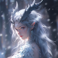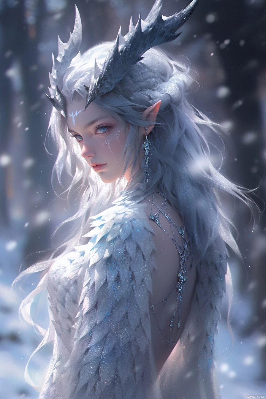 a snowy environment, and she is turned to the side, looking away from the viewer. She has what appears to be feathers adorning her shoulder area, which could suggest that she might have some bird-like qualities or transformation abilities commonly found in