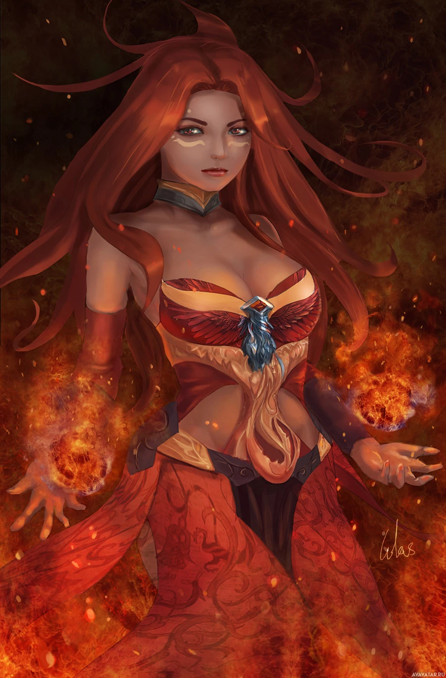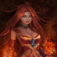 red hair and is wearing a red outfit with golden accents, suggesting she might be a powerful or significant figure within the context of the game. The background features what appears to be flames, adding to the fantasy and mystical elements associated with her character.