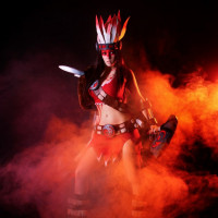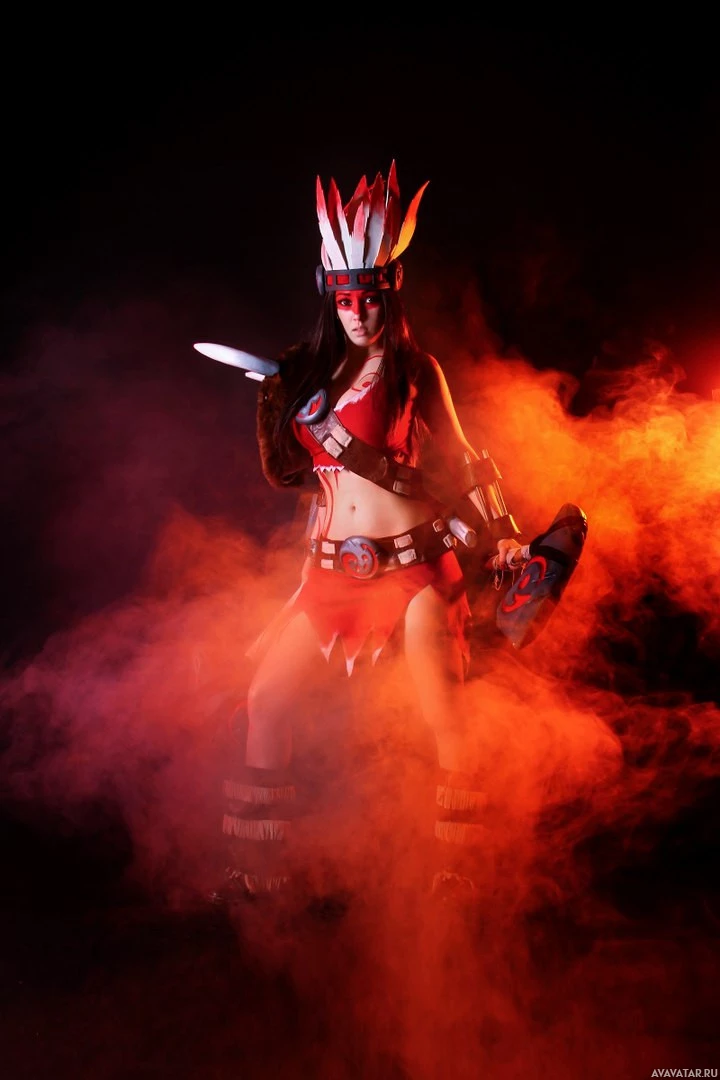 feathered headdress, holding what appears to be an axe with a long handle. Surrounding the figure are effects such as smoke or fog, enhancing the dramatic appearance of the cosplay. The image captures the spirit of fantasy and