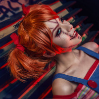 red hair styled in pigtails. She has makeup applied to give her a somewhat eerie or gothic look. The woman is smiling and appears to be looking directly at the camera. She is wearing an outfit that includes a blue apron with some