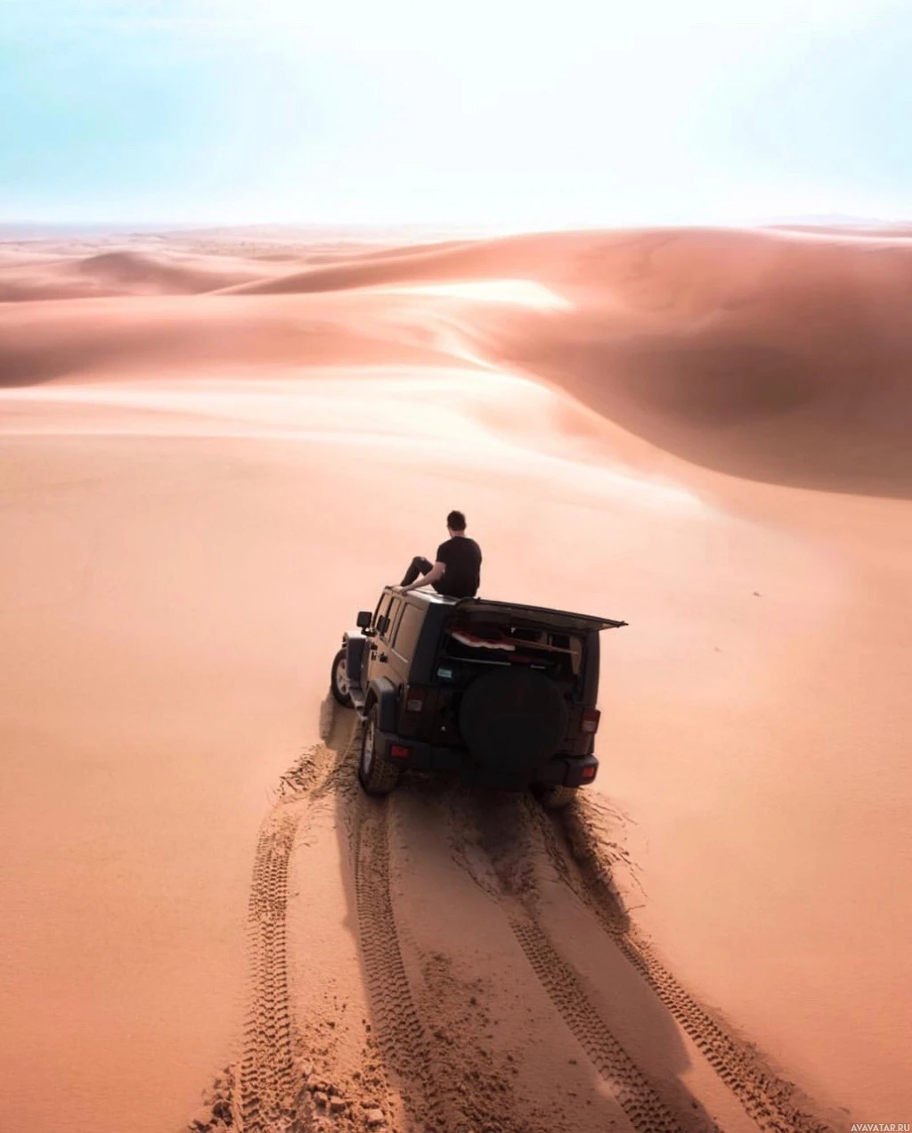 a clear sky and sand dunes visible in the background. There are several tire tracks leading up to where the person is seated, suggesting