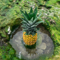 На картинке изображен один ананас, сидящий в небольшом круглом бассейне с водой. Окрестности покрыты мхом и тем, что кажется камнями или камнями. Это создает впечатление естественной среды, где ананас был помещен по какой-то причине, возможно, как часть художественной инсталляции или концепции фотографии.