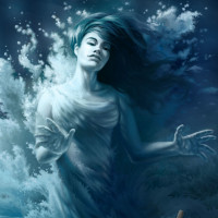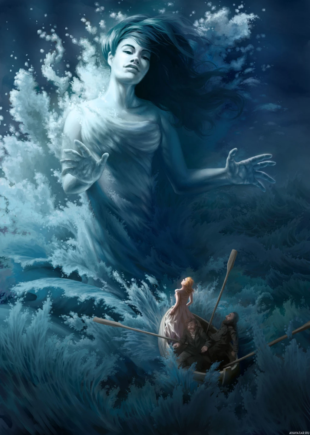 the ocean waves with her hair flowing freely, adding a mystical or fantastical element to the scene. The color palette is dominated by blues and greens, evoking