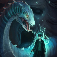 a fantasy scene with a character standing in front of a serpent or dragon-like creature. The creature has an intimidating appearance, with large eyes and