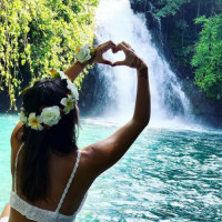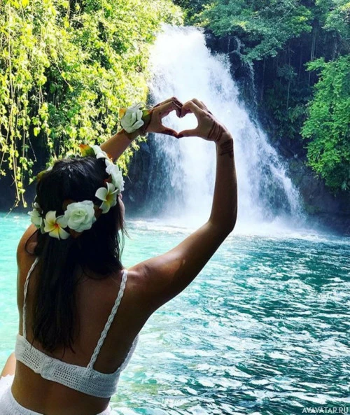 dark hair and are wearing a white floral wreath on their head, which is indicative of a traditional lei for a Hawaiian setting or luau. In front of them is a picturesque waterfall cascading into blue-