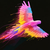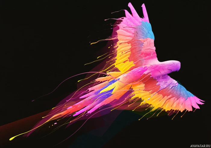 vibrant colors, with the feathers rendered in a rainbow of hues such as pink, purple, yellow, and blue. The background is dark, providing