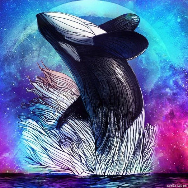 a cosmic scene with stars and nebulae, suggesting a connection to space or possibly the ocean's depth. The orca is illustrated in