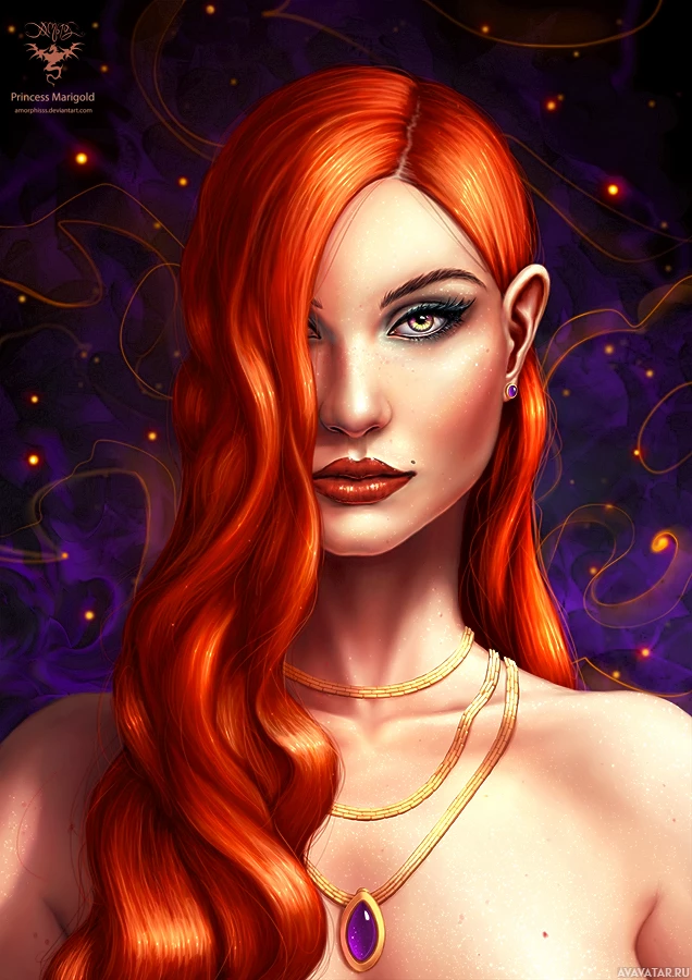 an ornate necklace and has pointed ears, reminiscent of elf or fairy features in fantasy artwork. Her expression is neutral but somewhat intense. The background has swirling