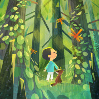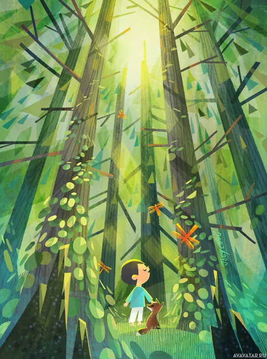tall trees in a forest, holding the hand of what appears to be a fox. The setting is sunny and serene with