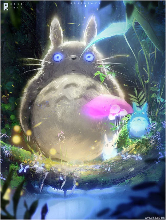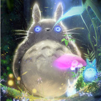 an animated movie or series, known as Totoro from the Studio Ghibli film "My Neighbor Totoro." Surrounding Totoro are various elements of fantasy: there's a forest setting with greenery and flowers, some small creatures like rabbits, and what looks like
