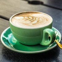 a cup of coffee, which appears to be a latte or a similar type of espresso-based drink. It is placed on what looks like
