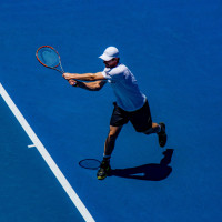 tennis court appears to be outdoors with blue clay, which is not a typical surface for tennis. The player's position suggests he might be preparing for or just finished executing a swing at the ball.
