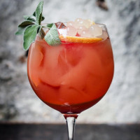 a sprig of mint. The drink is placed on what appears to be a wooden table against a backdrop that could suggest