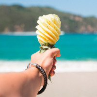 an ice cream cone. There is also a pineapple in the background, suggesting that this photo might have been taken on a beach or near one. The hand is extended towards the camera, showcasing the item being held.