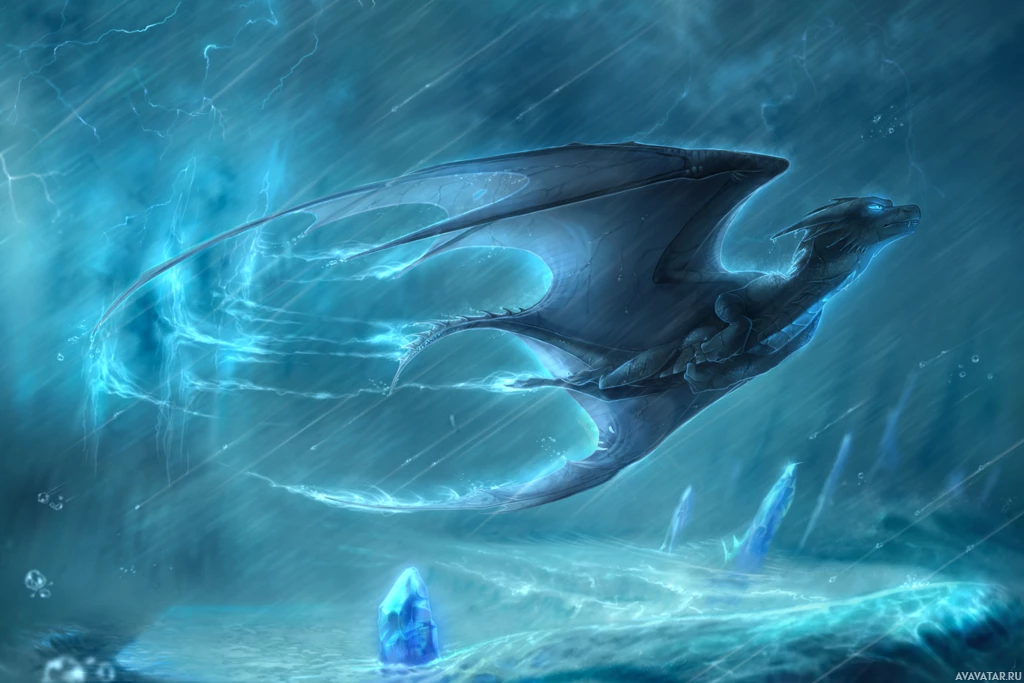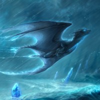 ominous clouds and what appears to be churning seas or turbulent waves beneath the dragon's feet. There are also floating icebergs or pieces of ice, suggesting a harsh,