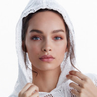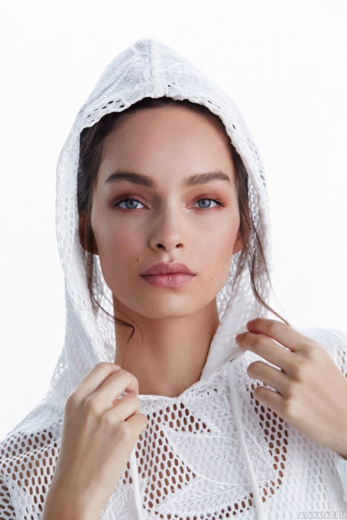 a hooded garment, possibly part of an outfit or a fashion accessory. She has her hands close together near the hood, which is