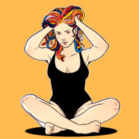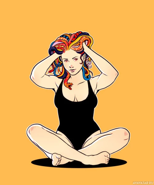 a female character with vibrant, multicolored hair styled in dreadlocks or braids. She is depicted sitting cross-legged on the ground, resting her head on her hands as if she's deep in thought or perhaps tired. She is wearing