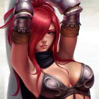 red hair wearing some form of armor or clothing inspired by historical warrior or fantasy themes. She is resting her head on what looks like a shield or similar