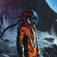 The image features an astronaut in a space suit standing on what appears to be the surface of the moon, looking towards the Earth. Behind the astronaut is the vast expanse of space with planets visible in the distance and stars twinkling above. The scene conveys a sense of exploration and the wonders of space travel.