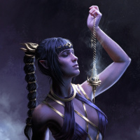 purple hair, wearing armor and holding an amulet close to her face. She has closed eyes and appears to be in